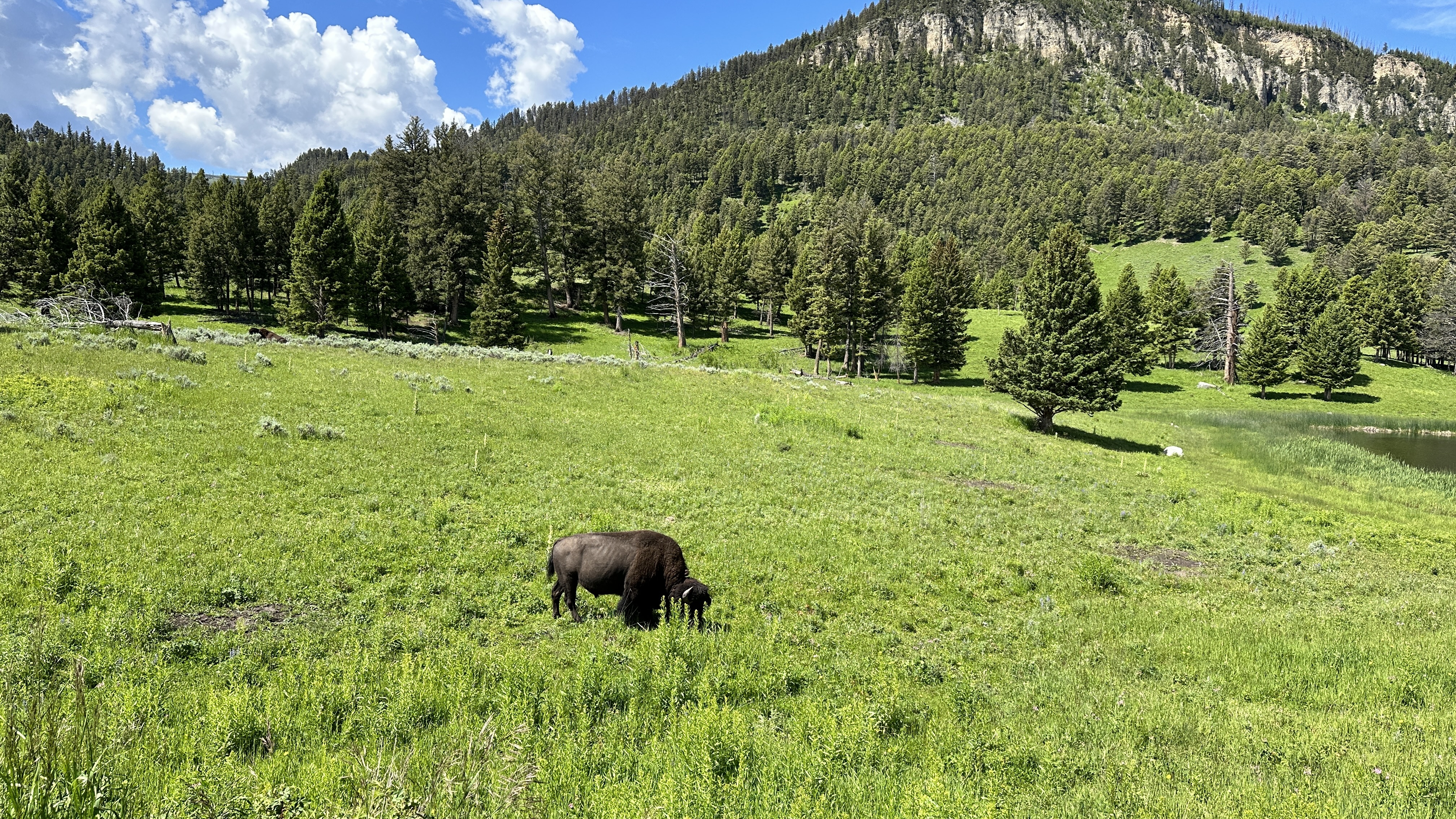 We continued driving north towards Gardiner along the Yellowstone River, stopping at Upper Falls View. It was one of the most breathtaking scenic routes I had ever seen. I could not get enough of the green meadow and bison-gazing view here.