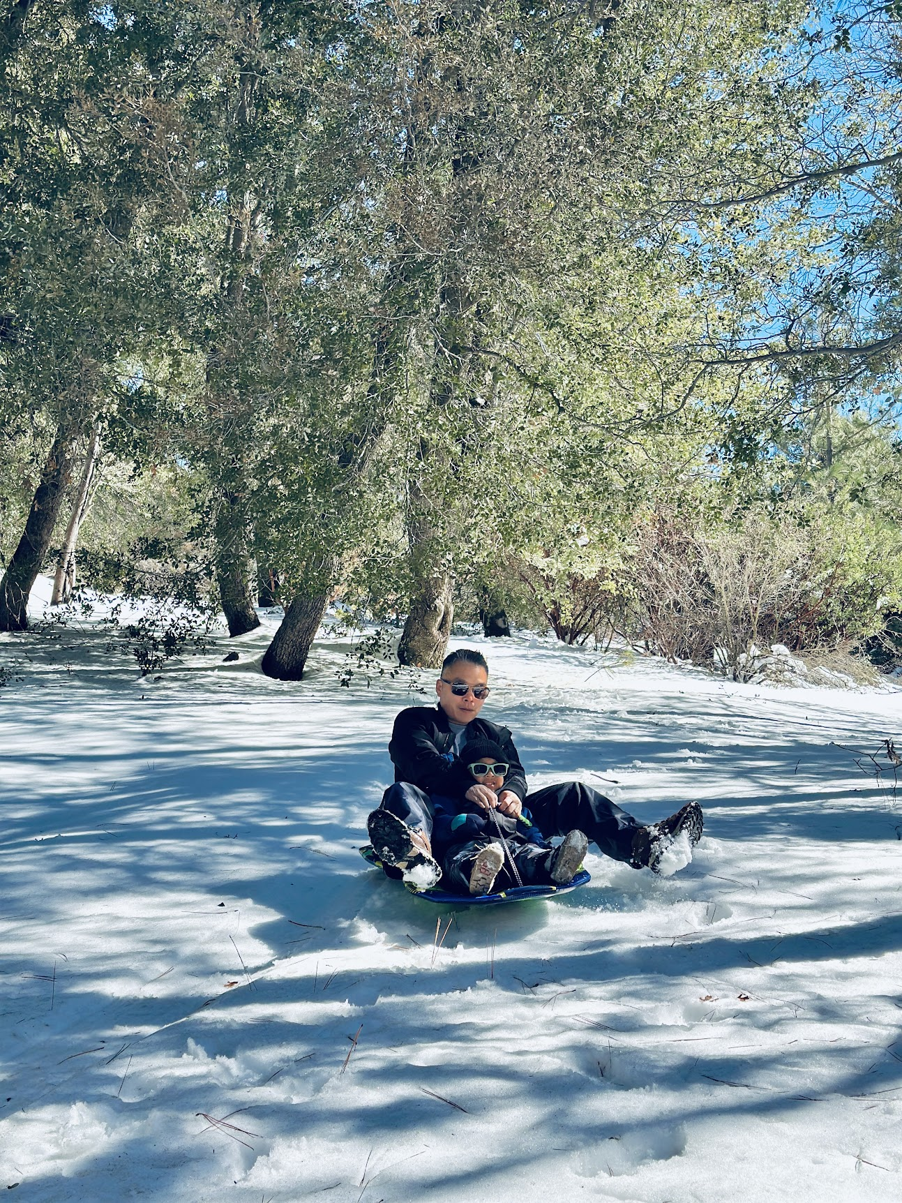 Dad’s job was to pick the spot and handle the driving to Lake Arrowhead. He downloaded offline maps before heading up and drove around until he found a quiet, uncrowded area perfect for sledding.